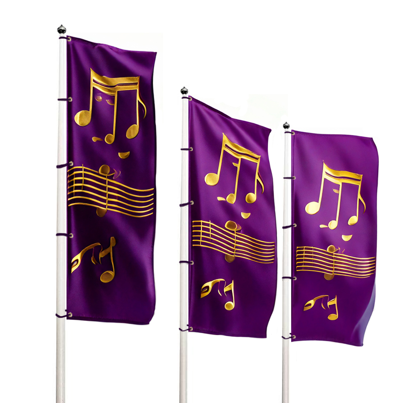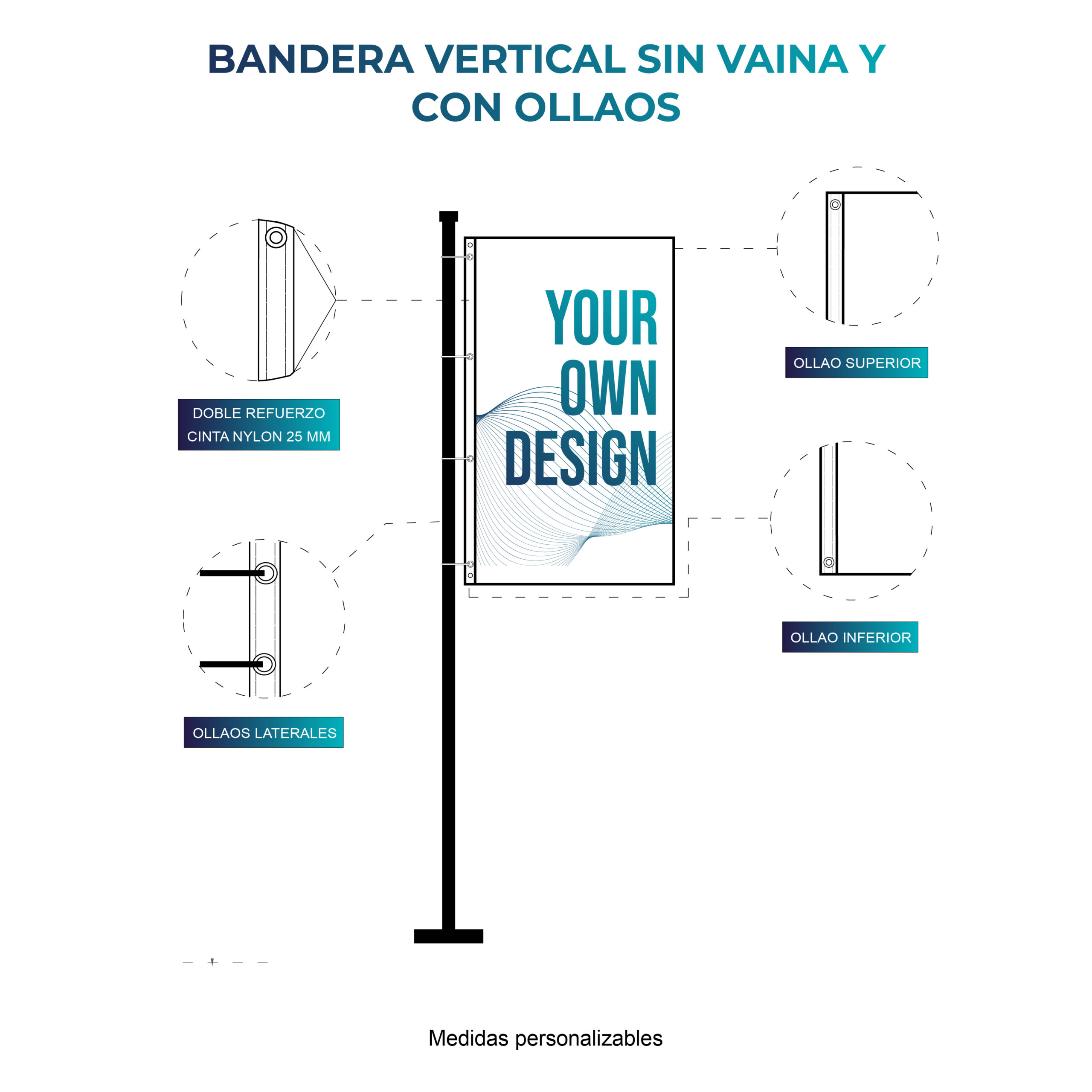 Bandera rectangular confeccionada en sentido vertical con medidas a tu elección. Ofrece el espacio que necesitas para su personalización con tus colores y/o diseños.